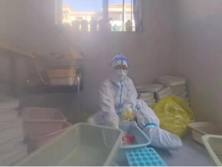 防護服、隔離衣、N95口罩、護目鏡、雙層手套、鞋套......全副武裝后,既不能喝水,也不能上廁所,在實驗室里一待就是七八個小時。在這次檢驗中,李寶華所在的二區(qū)樣品制備間每班四個人,流水線作業(yè),醫(yī)院檢驗科的工作人員負責將標本加入到提取試劑孔中,李寶華負責將樣本放在核酸提取儀里提取,然后將提取好的核酸交給下一位工作人員加入到八連排試管架中,然后四個人輪換的把八連管的蓋扣緊。在這個特別費手指頭的環(huán)節(jié),每個人都要連扣幾板,按著按著手指痛的就按不動了??此坪唵蔚墓ぷ鳎瑓s要求全神貫注,一絲不茍,認真的拆分、上架,同時要做好個人手衛(wèi)生,無數(shù)次重復的實驗,需要嚴謹細心的態(tài)度,確保實驗結(jié)果準確無誤。一天工作下來,滿身是汗,耳朵也被口罩壓出紅印子,面部也有深深的壓痕。雖然核酸檢測工作很艱辛,李寶華卻無悔加入到這支平凡而不普通的隊伍。防疫戰(zhàn)線上,無論是下沉小區(qū)值守的“守衛(wèi)者”,還是核酸檢測的“掃雷員”,都都抗議路上逆行孤勇者,他們用點點微光,匯聚起戰(zhàn)勝疫情的強大力量。我們向他(她)們致敬,感謝他們的每一份付出。