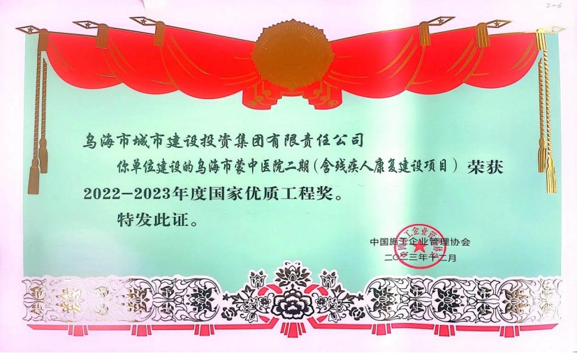烏海市城市建設(shè)投資集團(tuán)集團(tuán)有限責(zé)任公司烏海市蒙中醫(yī)院二期(含殘疾人康復(fù)建設(shè)項目)榮獲“國家優(yōu)質(zhì)工程獎”