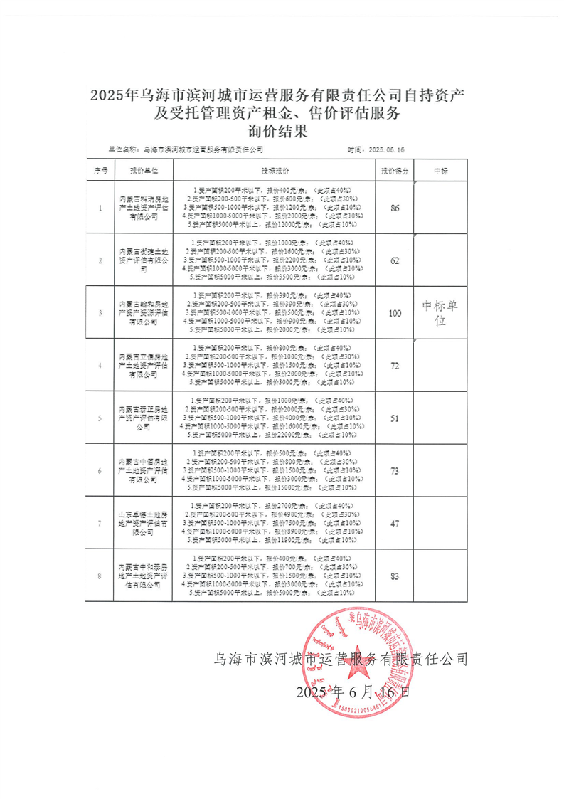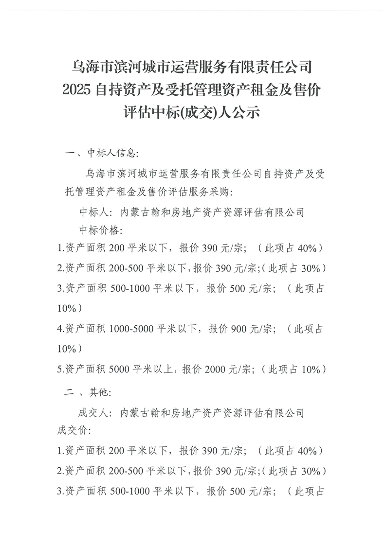 烏海市濱河城市運(yùn)營服務(wù)有限責(zé)任公司2025自持資產(chǎn)及受托管理資產(chǎn)租金及售價評估中標(biāo)(成交)人公示