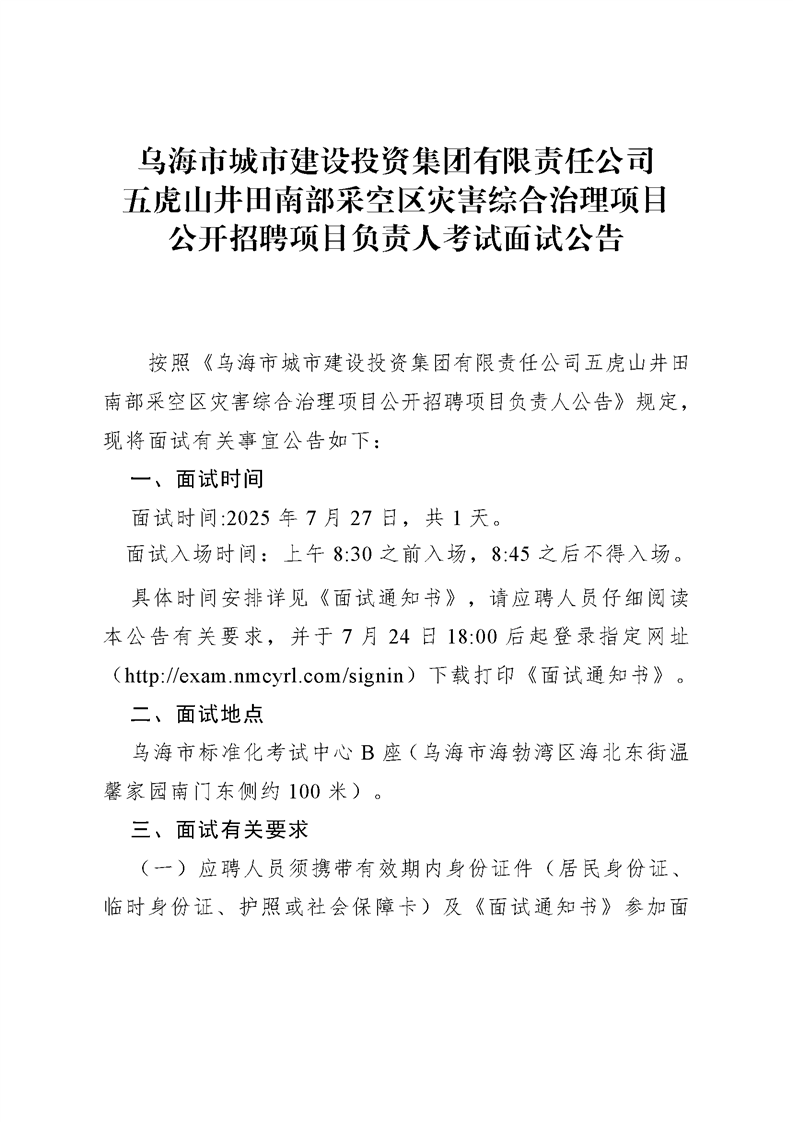 烏海市城市建設(shè)投資集團有限責任公司五虎山井田南部采空區(qū)災(zāi)害綜合治理項目公開招聘項目負責人考試面試公告