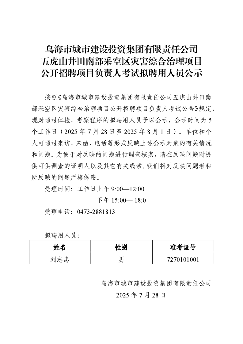 烏海市城市建設(shè)投資集團有限責任公司五虎山井田南部采空區(qū)災害綜合治理項目公開招聘項目負責人考試擬聘用人員公示