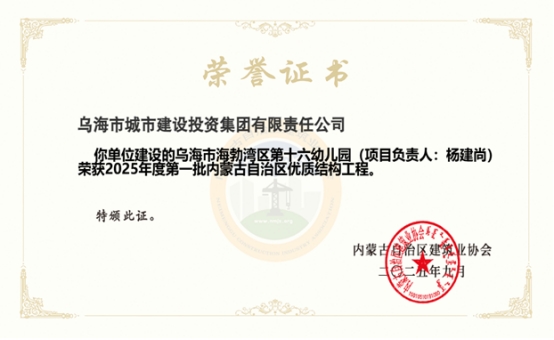 近日,市城投集團(tuán)公司代建實施的烏海市海勃灣區(qū)第十六幼兒園項目,榮獲2025年度第一批內(nèi)蒙古自治區(qū)優(yōu)質(zhì)結(jié)構(gòu)工程。
