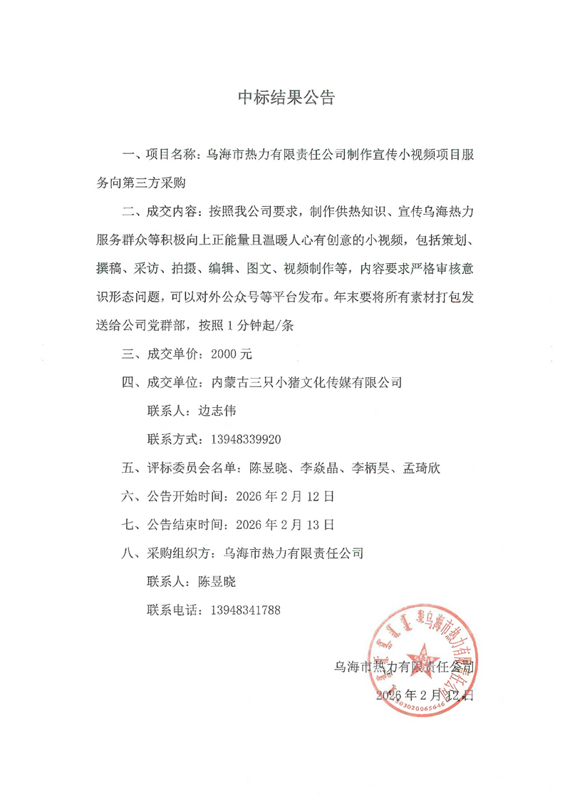 - 2026-02-25烏海市熱力有限責任公司車輛維修保養(yǎng)服務(wù)采購成交結(jié)果公告
