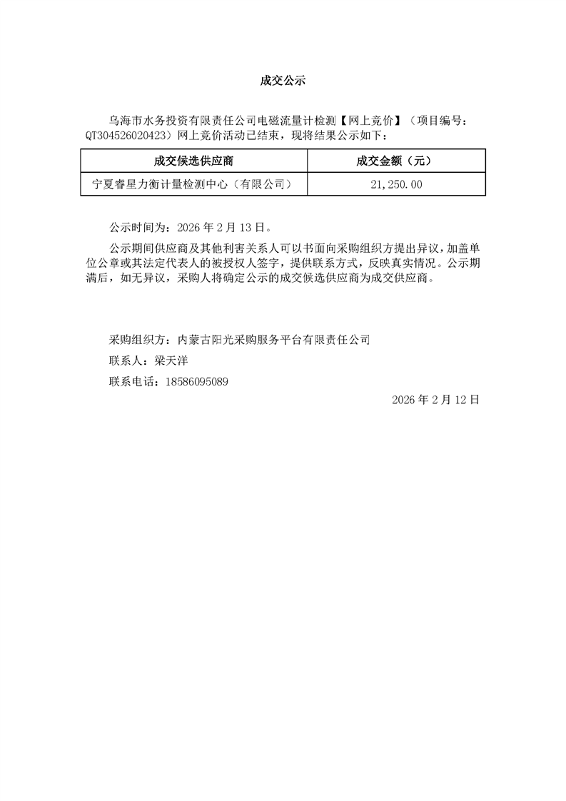 烏海市水務(wù)投資有限責(zé)任公司電磁流量計(jì)檢測(cè)【網(wǎng)上競價(jià)】結(jié)果公示