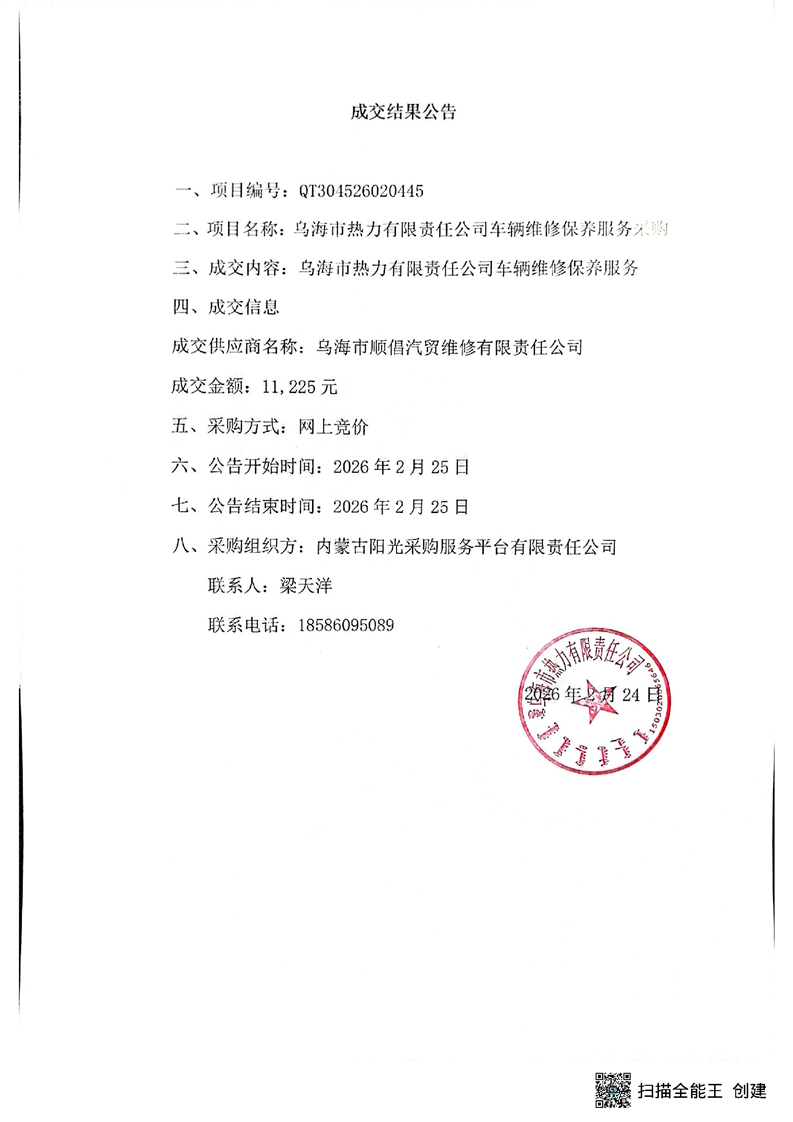 烏海市熱力有限責(zé)任公司車(chē)輛維修保養(yǎng)服務(wù)采購(gòu)成交結(jié)果公告